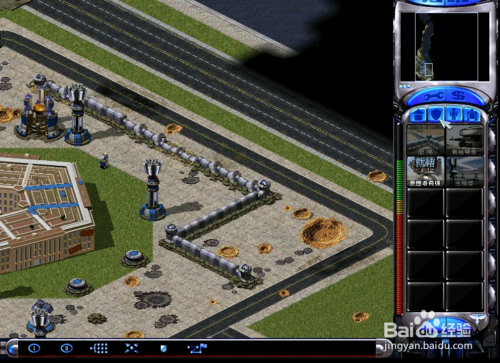 仇敌的本家儿基地前面有两座磁暴线圈,比力难攻,所以我们从侧面杀进去,直接杀得处所措手不及,摧毁仇敌的发电厂和建造厂,仇敌的磁暴线圈就没用了。