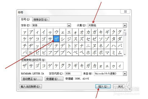 在“子集”中选择“片化名”,并鄙人方选中片化名ザ,点击“插入”。