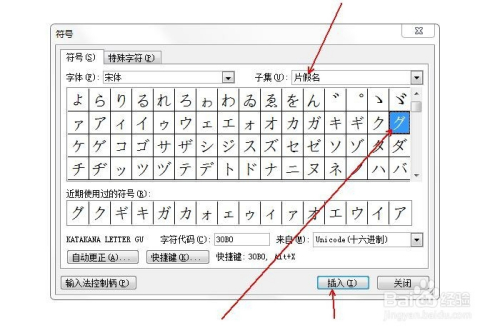 在“子集”中选择“片化名”,并鄙人方选中片化名グ,点击“插入”。