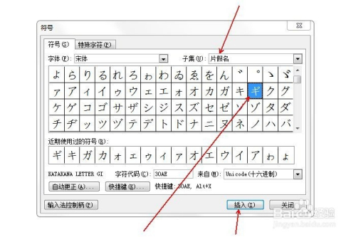 在“子集”中选择“片化名”,并鄙人方选中片化名ギ,点击“插入”。