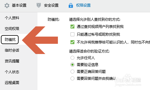 然后对应的页面左侧找到并点击“防骚扰”这一项,然后右侧即可看到运行别人查找你的体例设置项了;