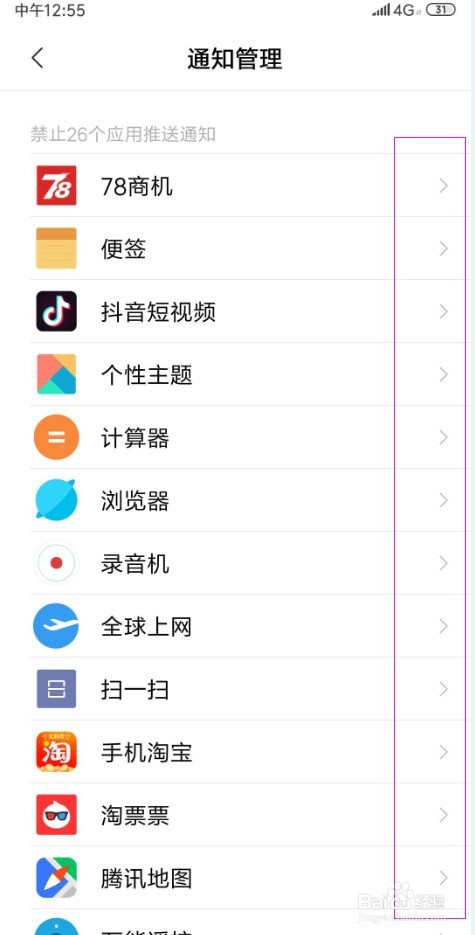 (方式一)首先,我们找到手机里面的 设置》通知和状况栏》通知办理》找到全数软件 选择 > 点开详情》 把 许可通知封闭
