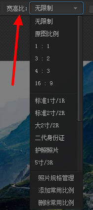 除此之外,我们还可以点击 宽高比 。这个功能的感化是,将裁剪部门的宽高设定当作固定的比例,以便利裁剪。