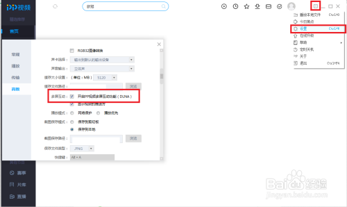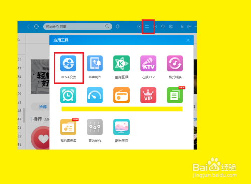 若是要投放到其它电脑的视频播放器上,就需要打开这台电脑的视频播放器——同样也是在设置那边找到DLAN投放选项并勾选,若是是播放是音乐,也可以投放音乐去到其它电脑的酷狗上,点击应用东西——开启DLNA投放。