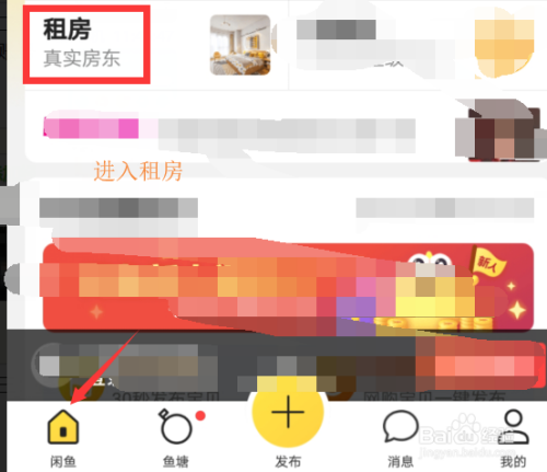 操作三:登入后点击咸鱼选项卡,找当上方的租房,点击进入,操作图片步调如下。