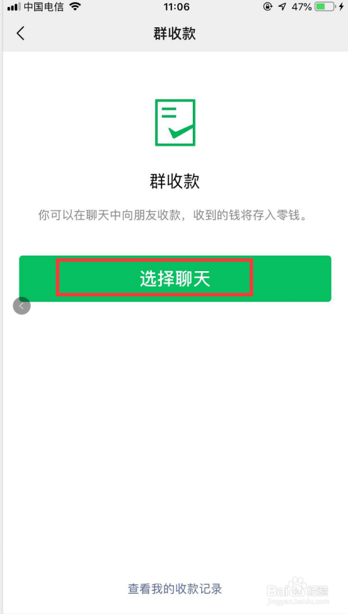 进入群收条目本家儿页后,点击本家儿页下的【选择聊天】,如图所示!点击后页面跳转到通信录界面。