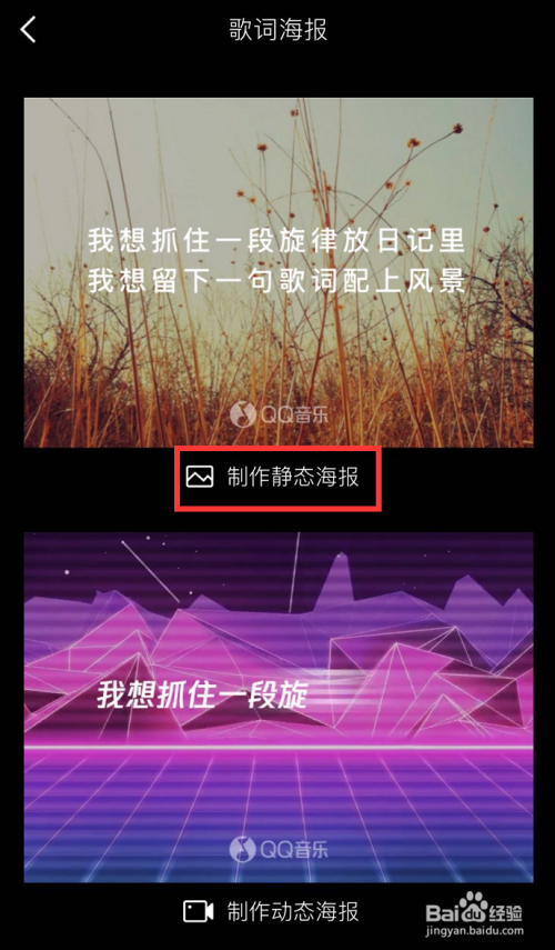 在歌词海报本家儿页下,找到【建造静态海报】选项,如图所示,点击该选项,进入海报建造!