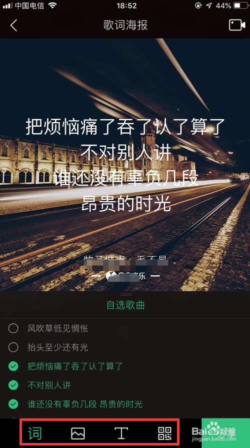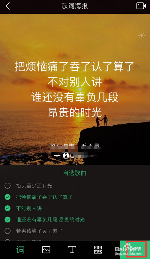 在海报建造界面下,勾选想要做当作海报的歌词(最多勾选6行),用下图小编用红笔勾出的功能别离设置歌词的字体、海报布景、是否添加二维码等!