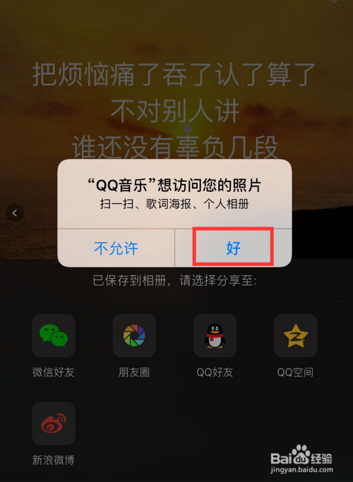 对设置的海报结果对劲后,点击右下角蓝色的【分享】。点击后,许可QQ音乐拜候照片,如图所示!