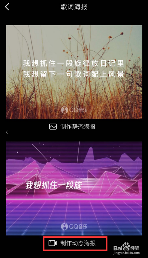进入歌词海报本家儿页后,在它的本家儿页下,找到【建造动态海报】选项,如图所示,点击进入动态海报建造!