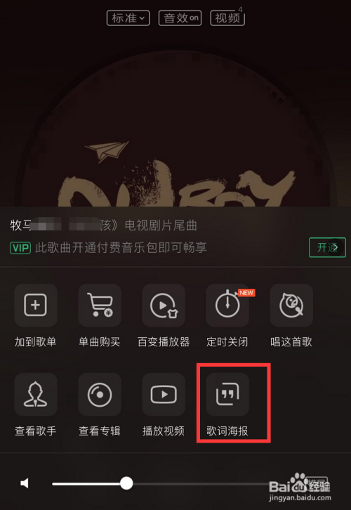 点击后,屏幕下方会弹出一个功能设置界面,点击界面上的【歌词海报】按钮,如图所示,点击后进入歌词海报本家儿页!