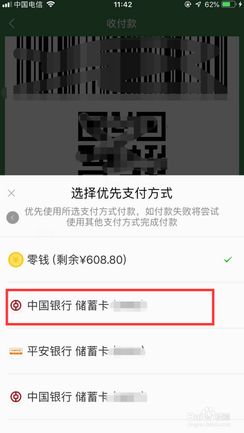 然后,细心不雅察就很轻易发现,优先付条目体例从本来的【零钱】酿成了新设置的【中国银行】,设置当作功!