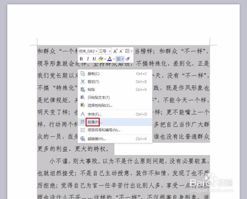 第五步:选中需要调整格局的文字,单击鼠标右键选择“段落”。