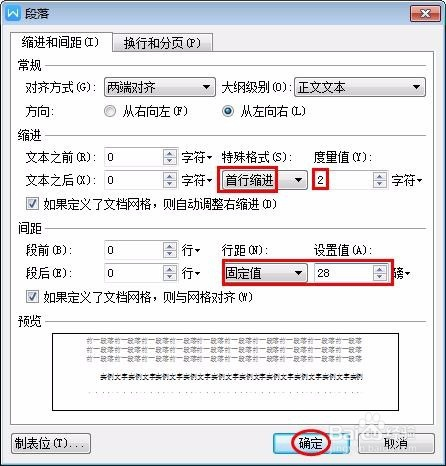 第六步:特别格局中设置为首行缩进2个字符,行距28磅。