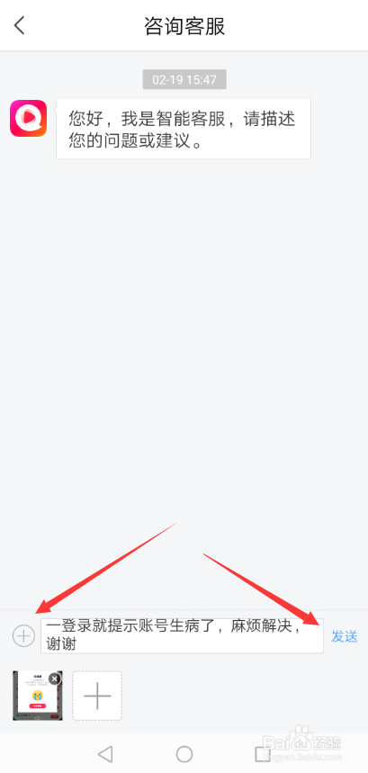 打开全平易近小视频咨询客服界面后,直接点击下面的【+】号,然后上传图片,在输入问题描述,然后点击【发送】,如下图所示。