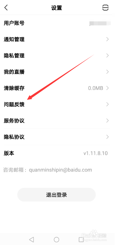 进入百度全平易近小视频设置界面后,直接点击【问题反馈】,如下图所示。