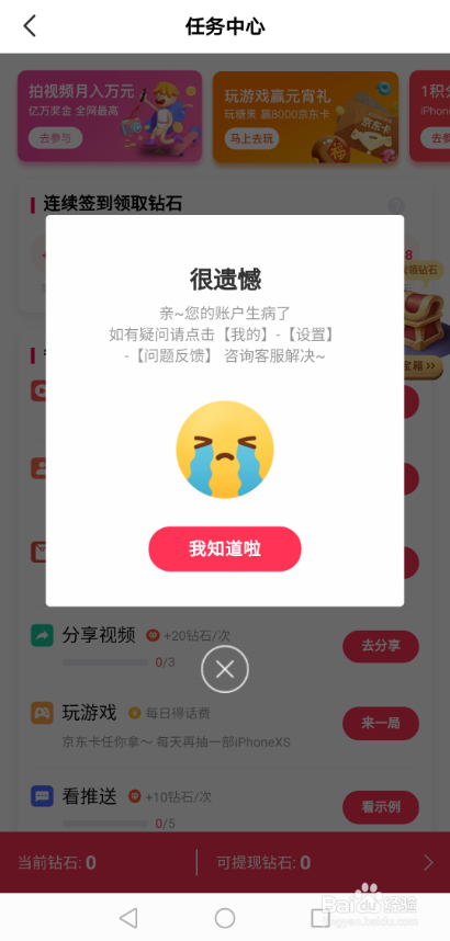 打开百度全平易近小视频,一登录就提醒你的账号生病了,如下图所示。