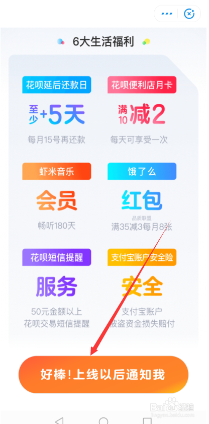 在移动花卡的第二页就可以看到预约打点的按钮,直接点击【好棒,上线今后通知我】,如下图所示。