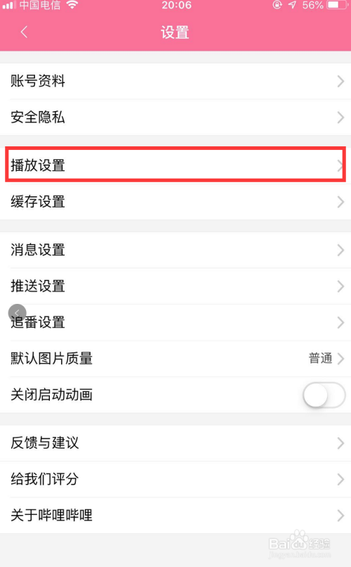 进入设置本家儿页后,在设置本家儿页下的浩繁设置选项中找到【播放设置】一项,点击该项!