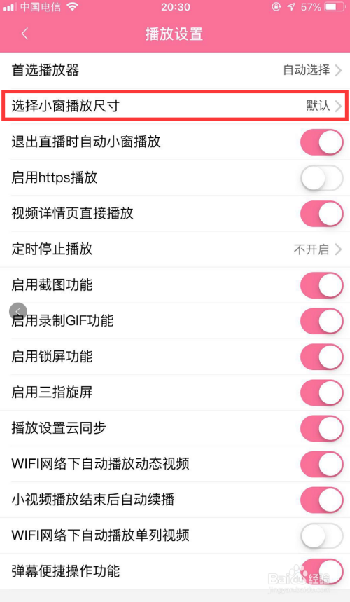 在播放设置本家儿页下,找到第二栏【选择小窗播放尺寸】,如图所示,点进该栏,对小窗播放尺寸进行设置!