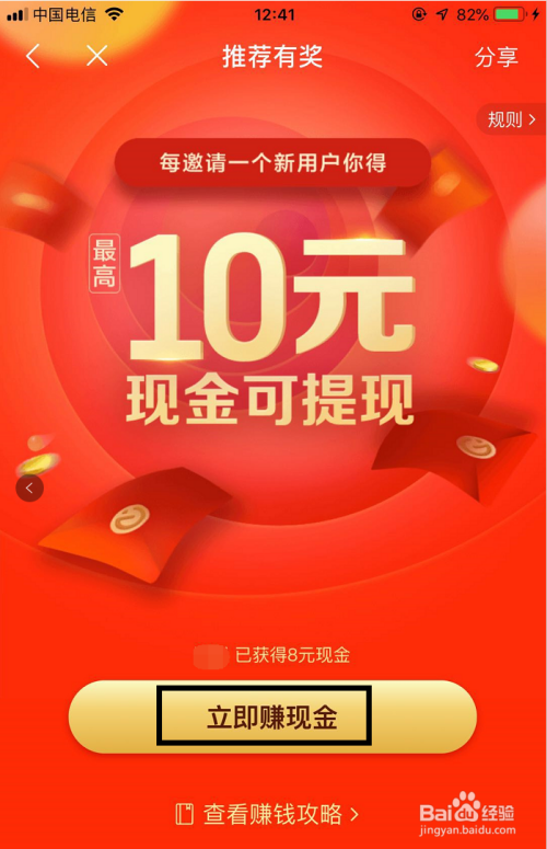 在保举有奖本家儿页下,找到并点击金色的【当即赚现金】按钮,如图所示!