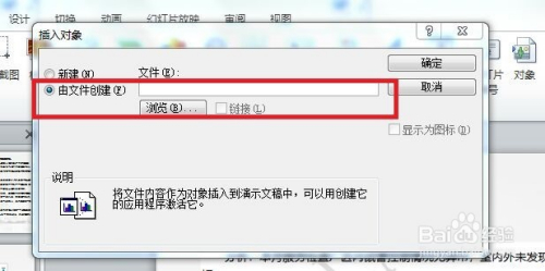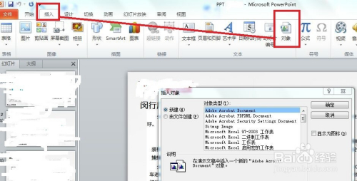 打开PPT文件,点击“插入”--“对象”,弹出“插入对象”对话框。