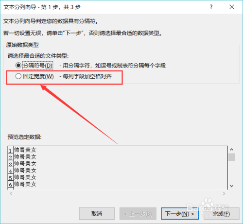 然后在弹出的窗口中选择【固定宽度值】一项,再点击下一步,如下图所示。