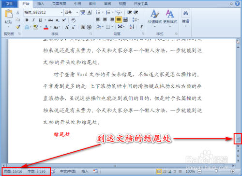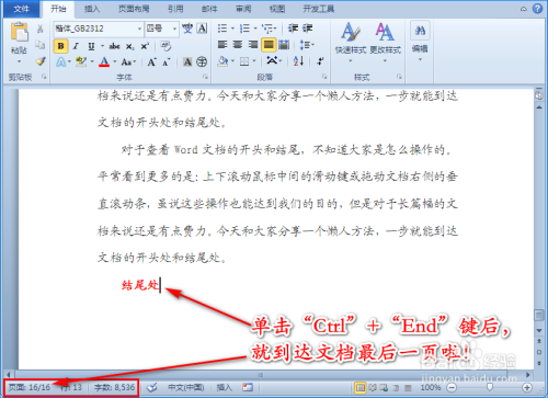 其实要想达到文档的结从头至尾处,我们只需同时单击键盘上的“Ctrl”+“End”键就行,这时电脑上显示的就是该文档的结从头至尾处。如图所示: