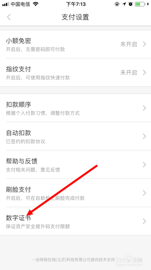 接着在 付出设置 的页面,点击最下端的 数字证书 。