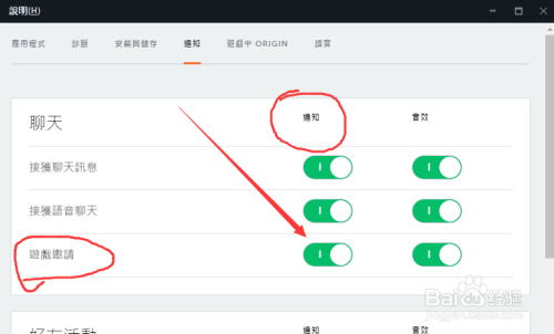此刻我们点击【邀请游戏】后面的,通知下方的绿点开关
