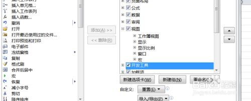 打开Excel,找到菜单栏中的“开辟东西”,若是未找到“开辟东西”点击“文件”选择“选项”下面的自界说功能,在自界说功能窗口中选择“开辟东西”