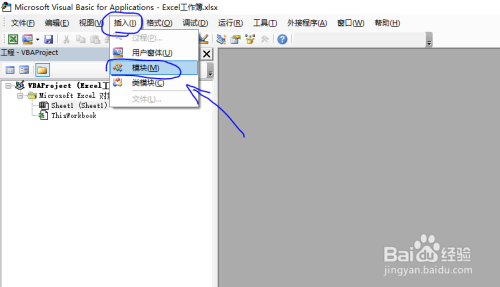 鼠标左键单击VBA窗口菜单栏中的插入,然后找到模块。