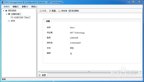 办理软件的利用:双击上图中快捷体例,打开,如下图所示。在DAQ办理设置装备摆设东西中查看设备是否正常,如正常设备中的产物型号无错误符号,若有错误符号请手动更新驱动
