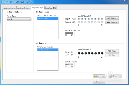 DIO功能,以Port为一组,每组中有若干通道,通道输入输出偏向,单通道可配,若设置为DO功能,输出凹凸状况可配;见图