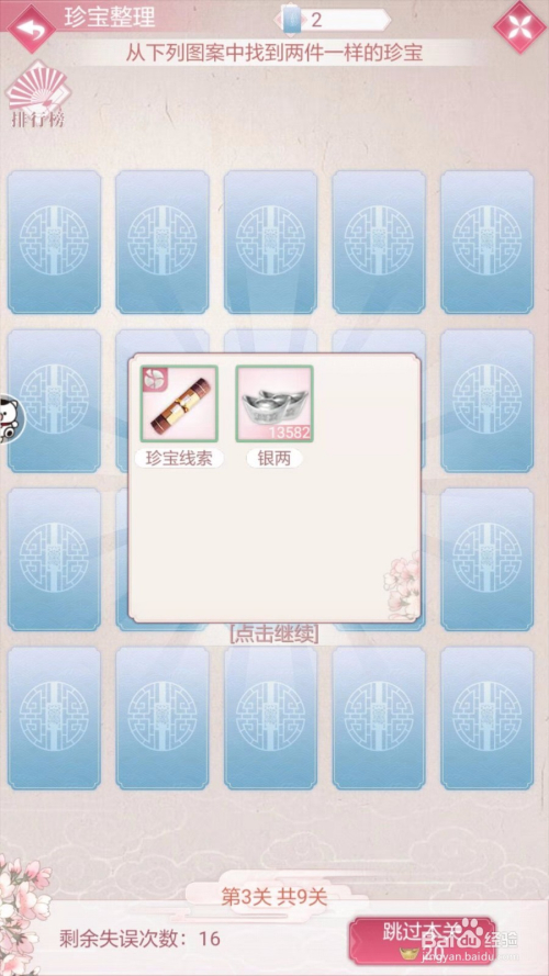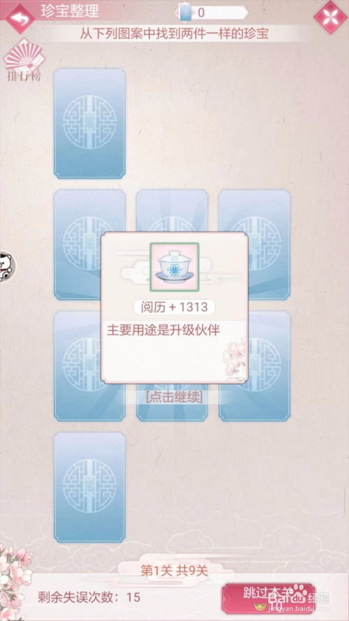 第三步:至宝清算按照级别分歧关卡数也会有所分歧,弄法跟对对碰一样,翻出两张一样的就会获得奖励,玩的时辰翻过的牌要记取,便利后续操作,因为翻拍牌的次数是有限的。