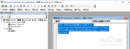 粘贴好代码之后,按下F5键运行即可实现Excel全屏显示且埋没了行号和列号。