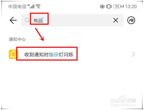 然后在设置页面的顶端,点击搜刮栏,输入“指示”做为关头字进行搜刮,就可以快速定位到呼吸灯的指导选项了。