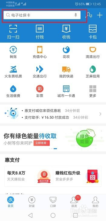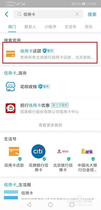 第二步在付出宝首页搜索框中,搜刮信用卡,点击信用卡还条目,如下图所示: