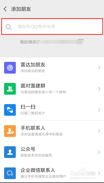 这时,会跳转到添加老友的页面,搜索框位置输入,你要添加老友的微旌旗灯号/QQ/手机号,如图所示