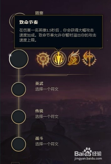在三个基石里选择“致命节拍”。上单剑圣是需要必然肉装的,这里点出致命节拍可以填补攻速。