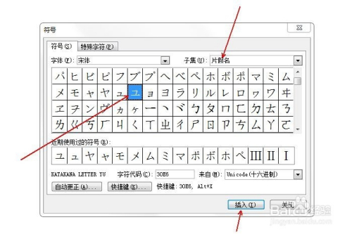 在“子集”中选择“片化名”,并鄙人方选中片化名ユ,点击“插入”。