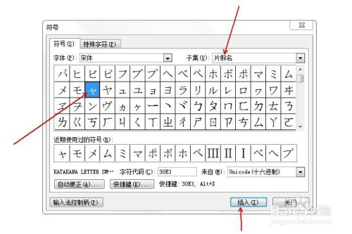 在“子集”中选择“片化名”,并鄙人方选中片化名ャ,点击“插入”。