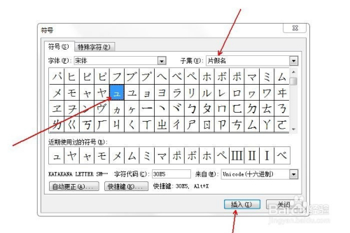 在“子集”中选择“片化名”,并鄙人方选中片化名ュ,点击“插入”。