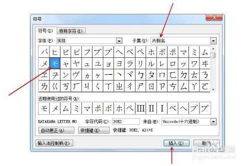 在“子集”中选择“片化名”,并鄙人方选中片化名モ,点击“插入”。