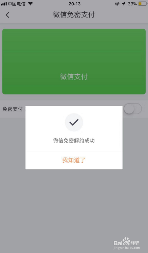 确认后,系统会弹出微信免密解约当作功的通知,如图所示!