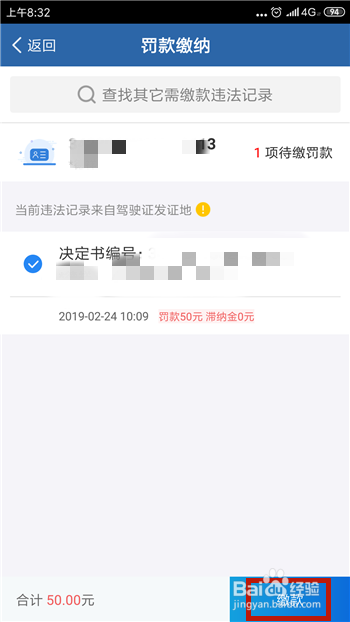 接下来可看到显示的当前违章,选摘要缴纳罚条目的违章并点击【缴条目】。