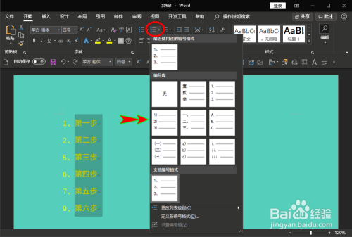 找到“编号”按钮后,我们点击右边的那个小三角形打开它的下拉菜单,鄙人拉菜单中的“编号库”中选择一个合适的编号样式。
