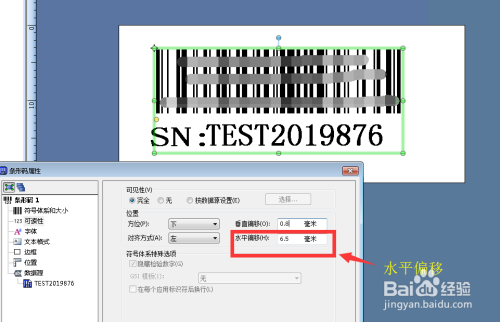 选择靠左对齐后,发现所有字符都挤在一堆了,这时,调整程度偏移的数值,以达到完全显示的结果。这个程度偏移值按照利用的条码纸张大小纷歧,数值也会纷歧样。