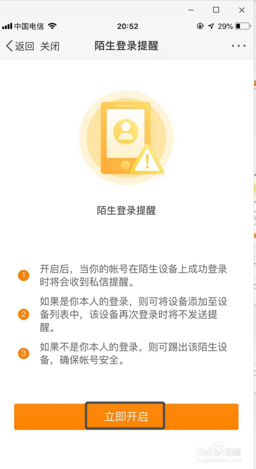 点击后在呈现的目生登岸提醒本家儿页下点击【当即开启】,如图所示!开启后若是你的账号在目生的设备上登岸,你将会收到私信提醒。若是不是你本人登岸,你还可以将该目生设备踢出来确保账号平安!