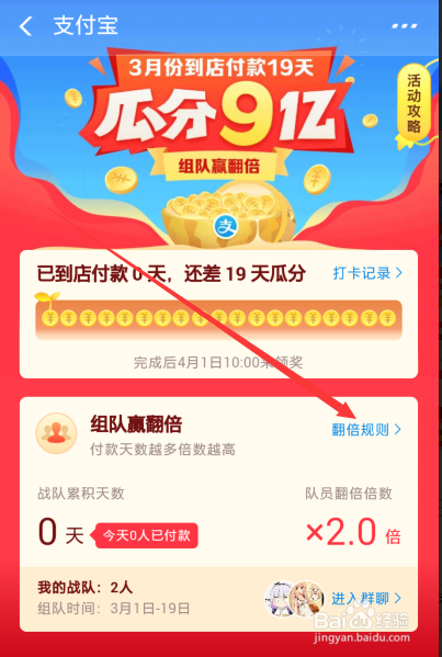 此刻我们就可以看到支付宝瓜分9亿红包活动组队翻倍数计较法则